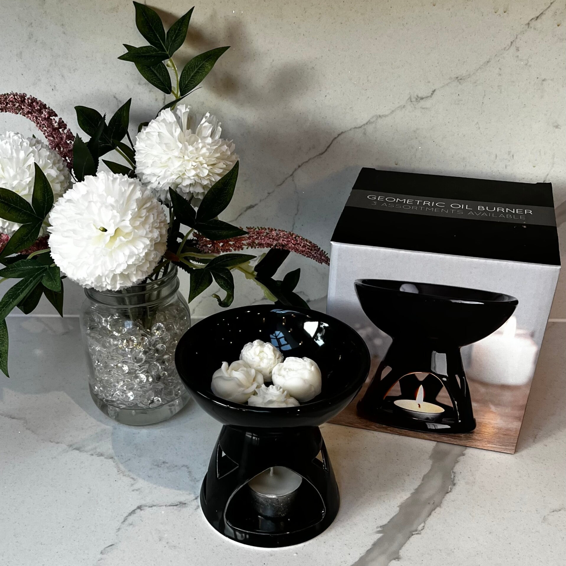 Elevate your home decor with this stunning glazed T-light burner! Featuring a sleek black finish and triangular cutouts. Just remember to consider the size and depth of the bowl when adding wax.